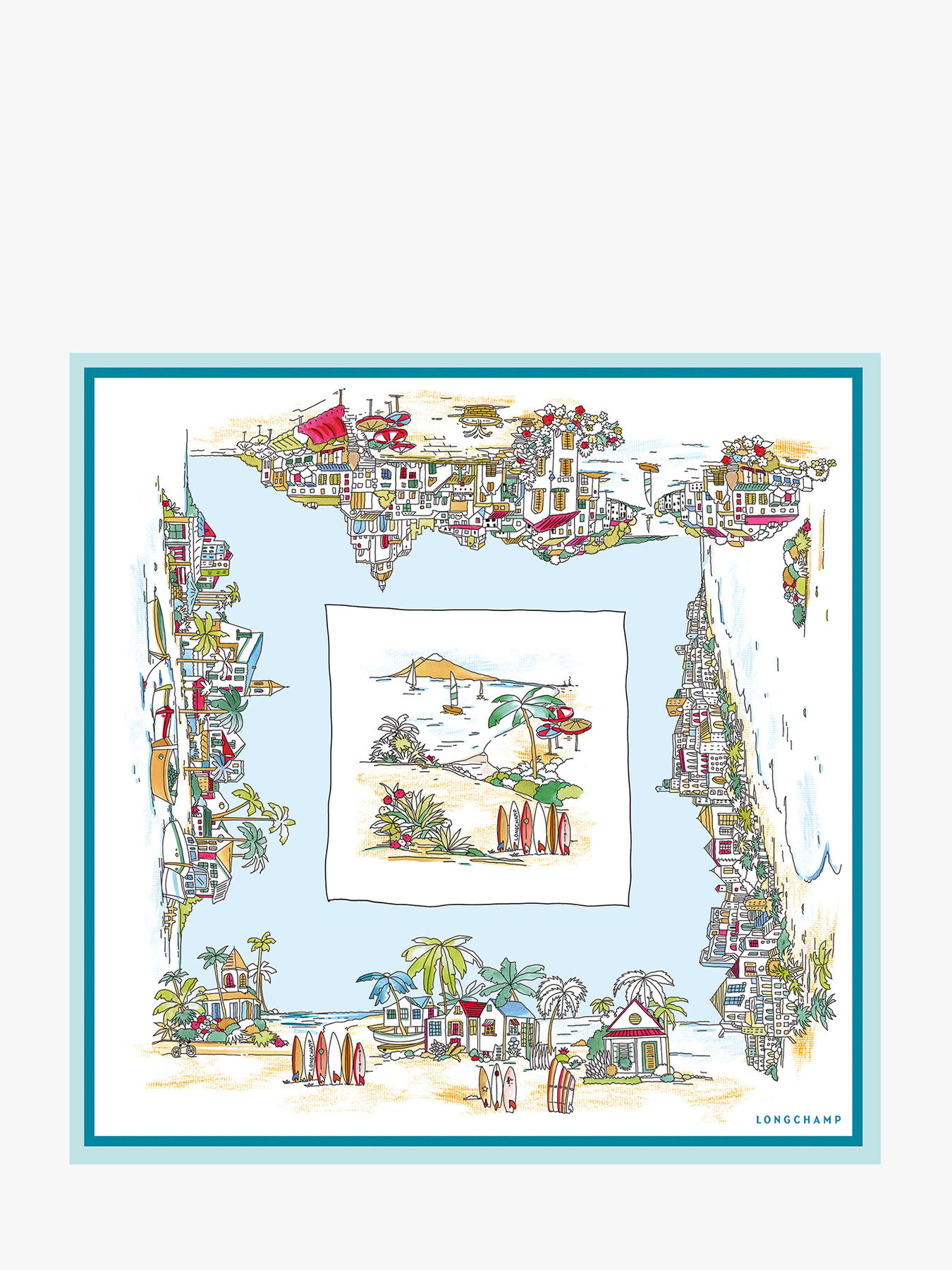 Le carré de soie 70 Vivement l'Été LONGCHAMP, en soie précieuse, capture l’essence des vacances estivales avec un imprimé vivant et joyeux. Ce motif dévoile un paysage ensoleillé où les célèbres planches de surf Longchamp bordent une plage animée, entourée de palmiers, parasols colorés, cabanes de plage pittoresques, bateaux et voiles flottant doucement. Le sable doré contraste magnifiquement avec la mer bleu azur, invitant à vivre pleinement l’été dans une ambiance détendue et festive. Ce carré de soie est l’accessoire parfait pour insuffler une touche de fraîcheur et de gaieté à vos tenues estivales.